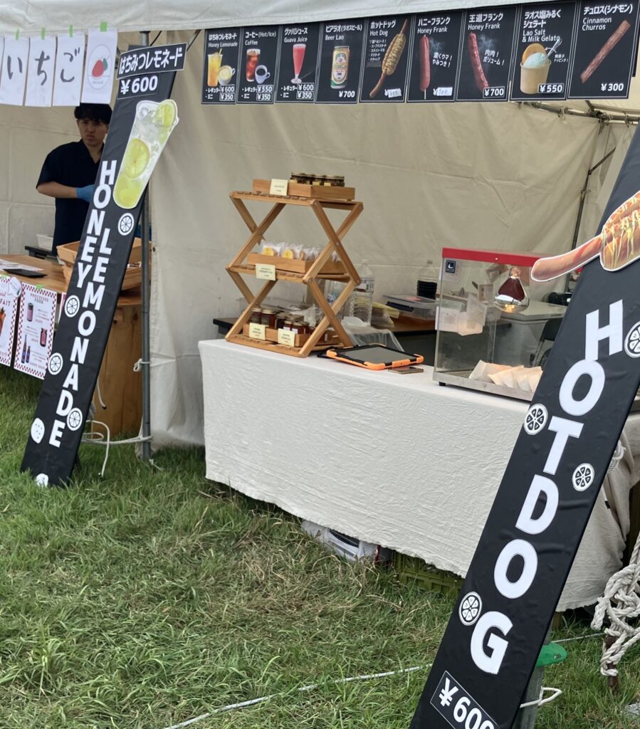 テントブースでは、爽やかな酸味が人気のはちみつレモネードをはじめ、ボリューム満点のホットドッグやフランクフルトなどを販売。