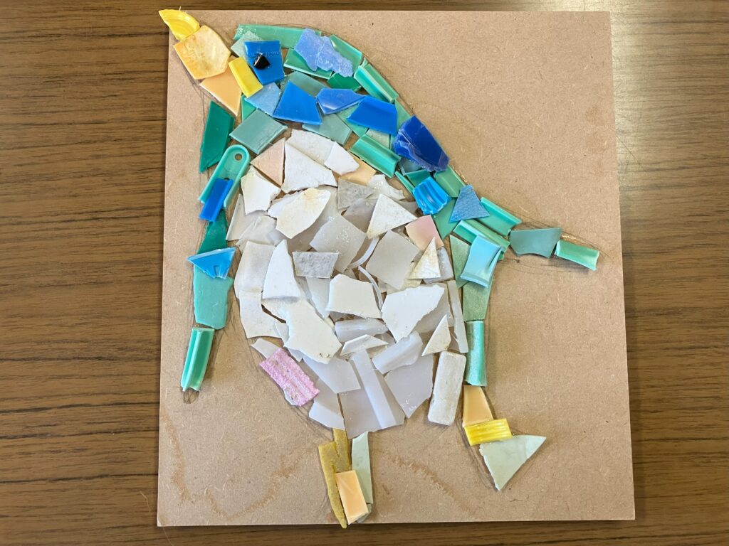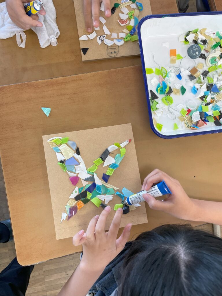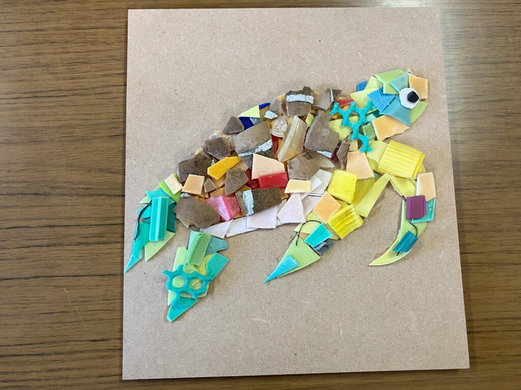 児童の皆さんは実際にごみを手に取り、「こんなものが海に流れ着くんだ!」と驚きながらも、「この形が魚に見える!」「色がきれい!」と夢中で素材を選び、海の生き物をモチーフにしたアート作品を制作しました。