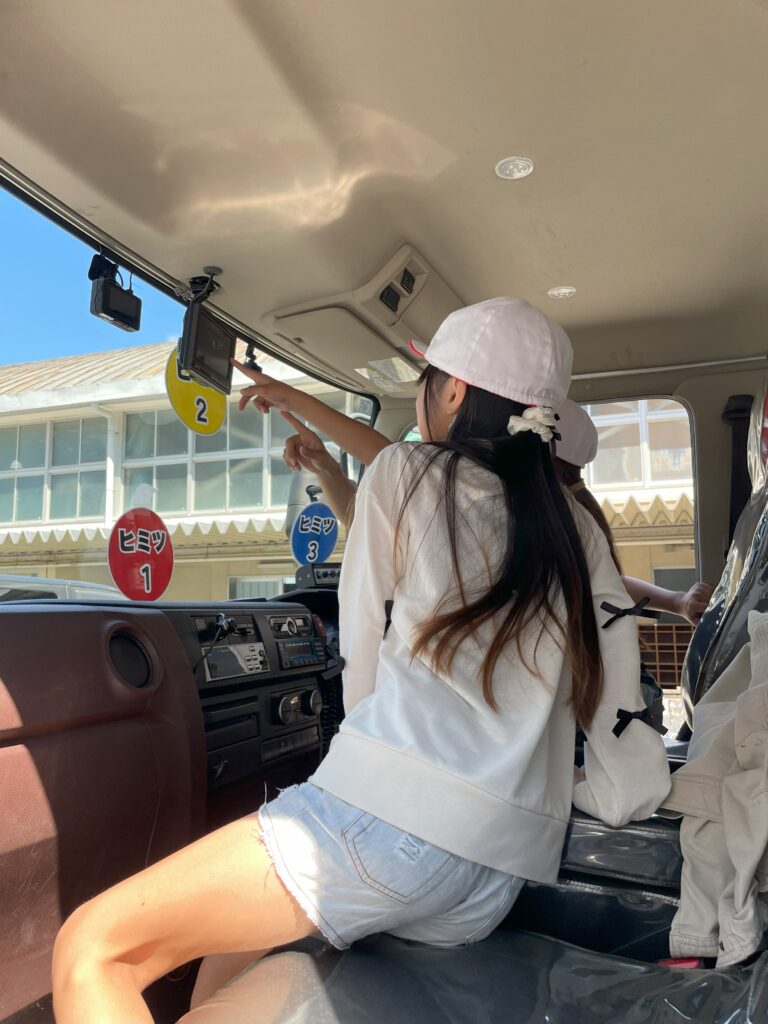 乗車体験では、運転席と助手席からパッカー車の「3つのひみつ」を発見し、車両の構造に興味津々の様子。