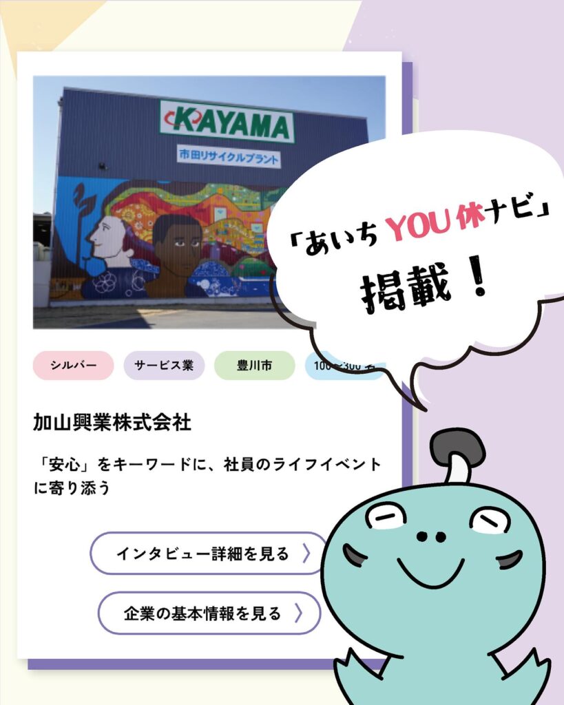 この度、愛知県が運営する働き方改革推進サイト「あいちマイスター YOU休ナビ」に、加山興業が掲載されました。