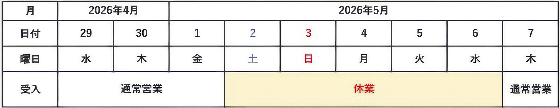 誠に勝手ながら下記のとおりゴールデンウイークの休業日をご案内させて頂きますので