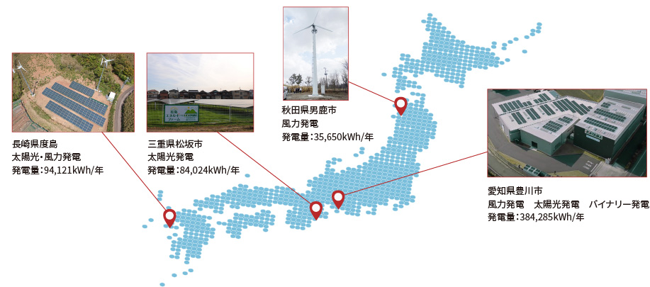自社設備以外にも松阪エネルギーファーム(三重県松阪市)に太陽光発電、度島エネルギーファーム(長崎県平戸市度島)に太陽光発電と風力発電設備、秋田エネルギーファーム(秋田県男鹿市)に風力発電を導入し、発電された電力は固定買取価格制度を利用して売電しており、クリーンエネルギーの普及に努めています。