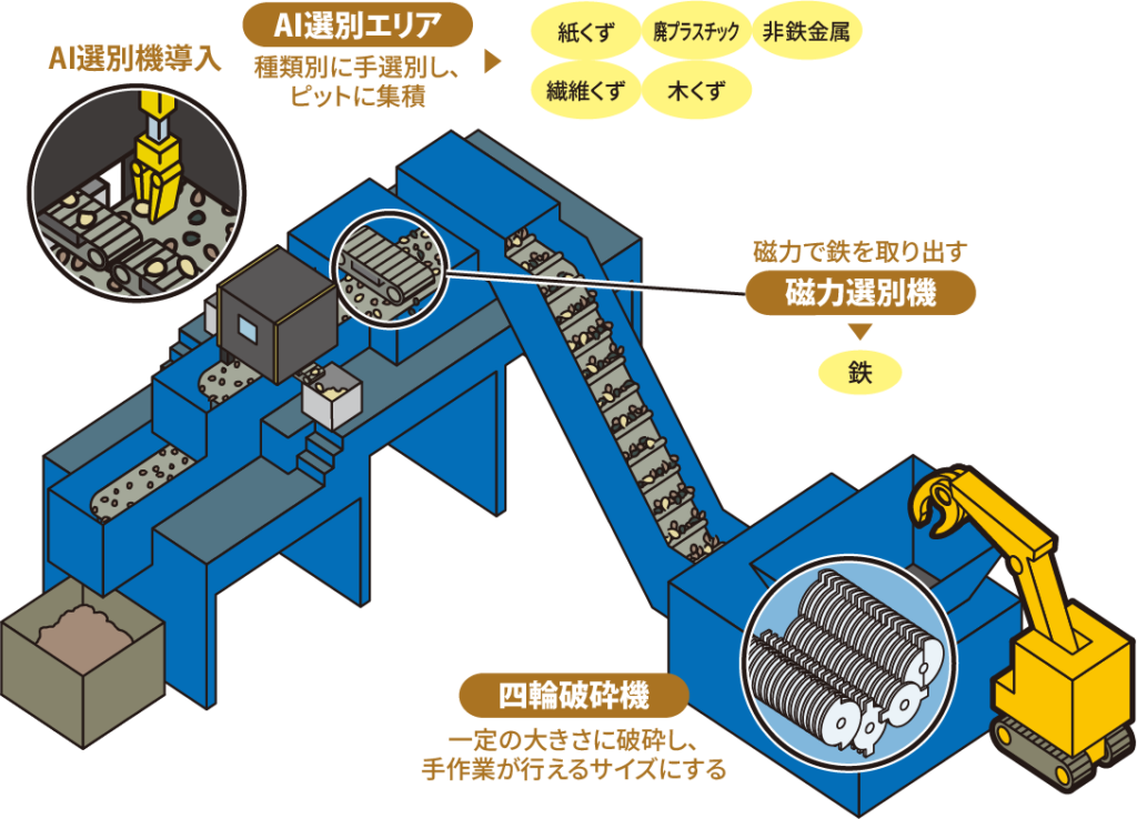 また、刃の軸を駆動させるモータは、上下の刃に各1台、計2台(200馬力×2)を備えており、低速回転のため、ほこりの発生を抑制し作業環境にも配慮しています。